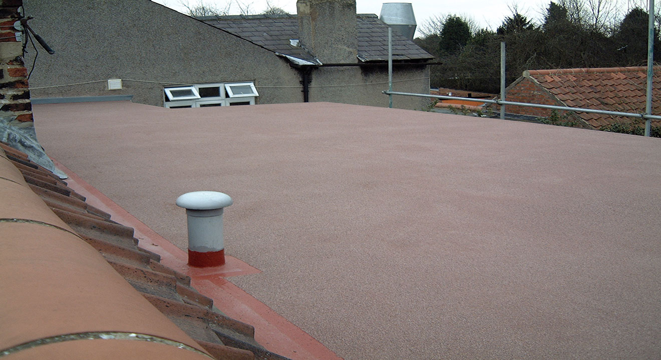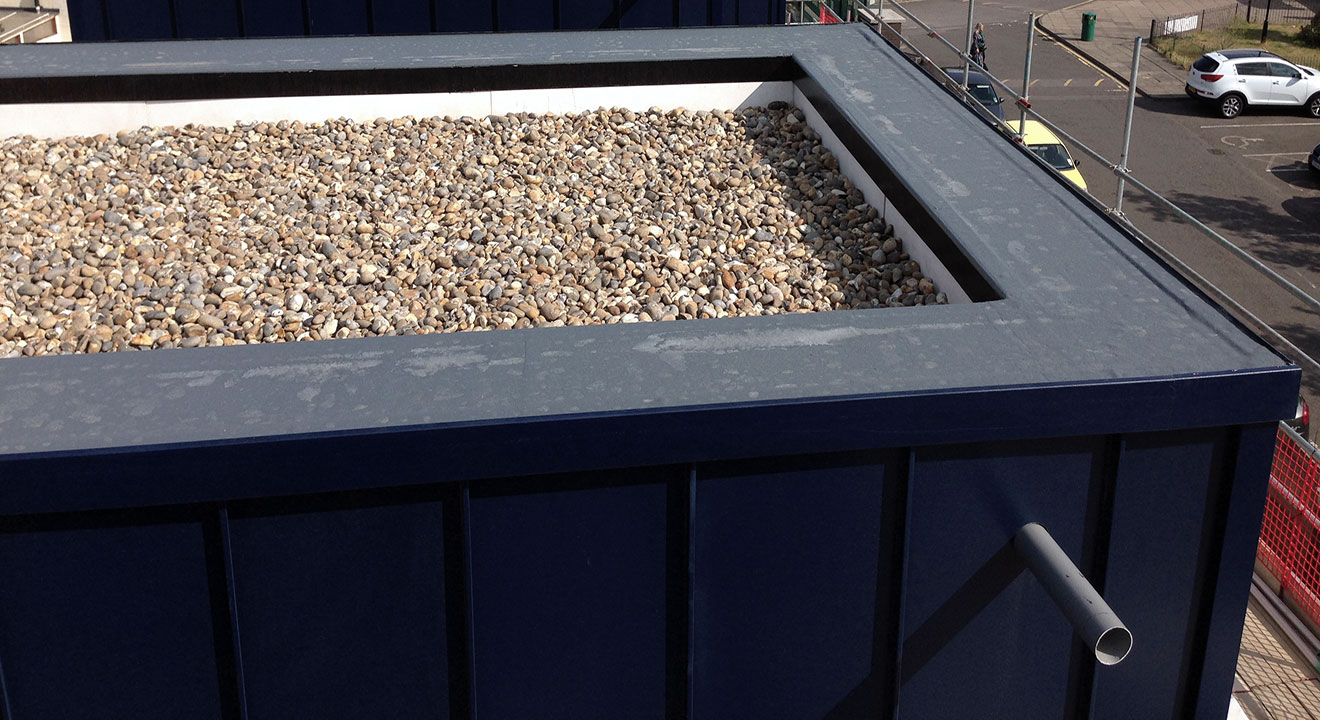 The size of a flat roof is nothing to worry about when using TuffStuff® GRP. This image highlights just how easily TuffStuff® can accommodate drains, ventilators, roof lights and flues.