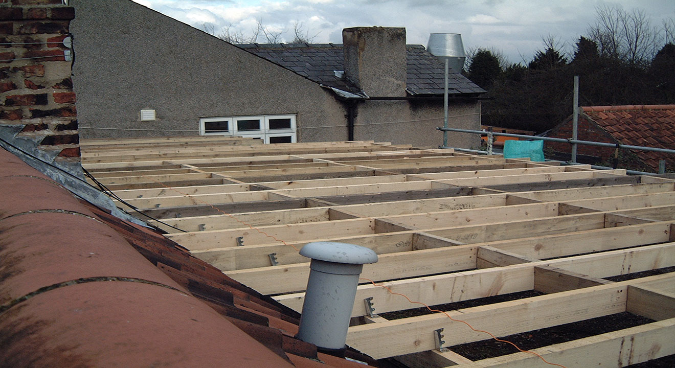 A large flat roof area fully prepared for decking to be installed.