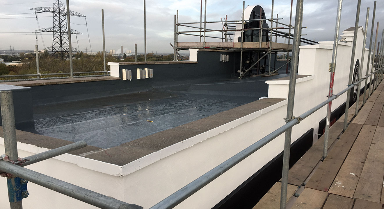 This image shows how TuffStuff® GRP can be used to fully waterproof unusual flat roof areas.